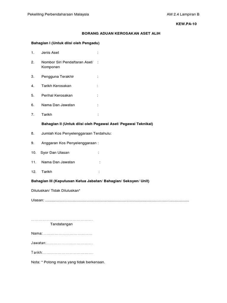 10 Kew Pa 10 Borang Aduan Kerosakan Aset Alih Doc Pekeliling Perbendaharaan Malaysia Am 2 4 Lampiran B Kew Pa 10 Borang Aduan Kerosakan Aset Alih Course Hero