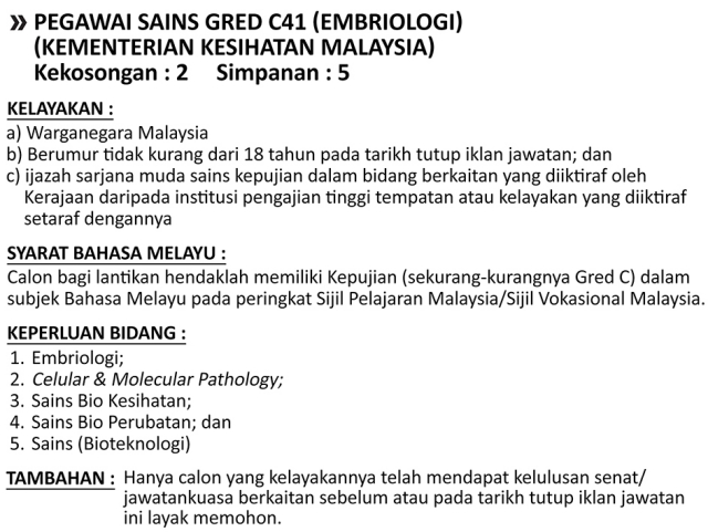 Pegawai Sains Gred C41 Embriologi Kementerian Kesihatan Malaysia